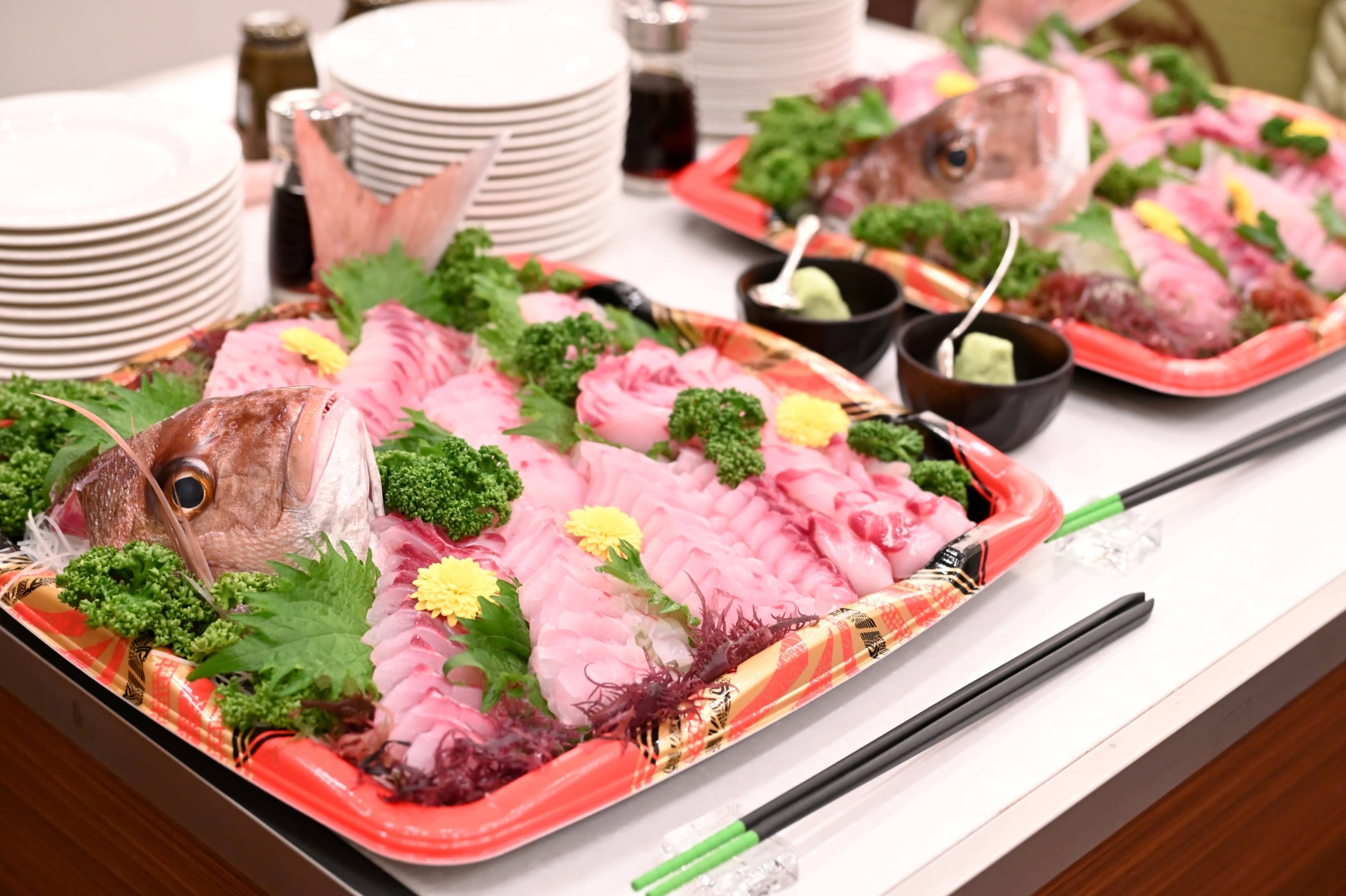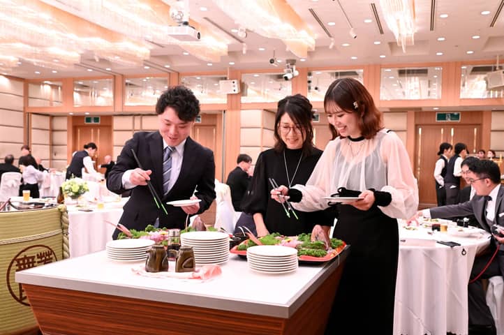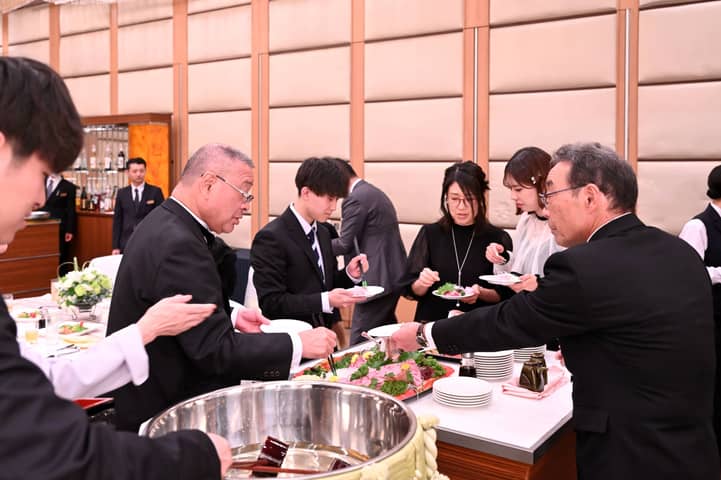 さらに、おふたりのキューピットとなった方からの心温まるお祝いとして、縁起の良い鯛のお刺身ビュッフェが振る舞われました。豪華で特別な差し入れに、ゲストの笑顔と歓声が広がります。