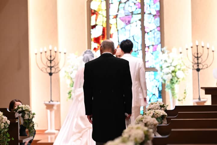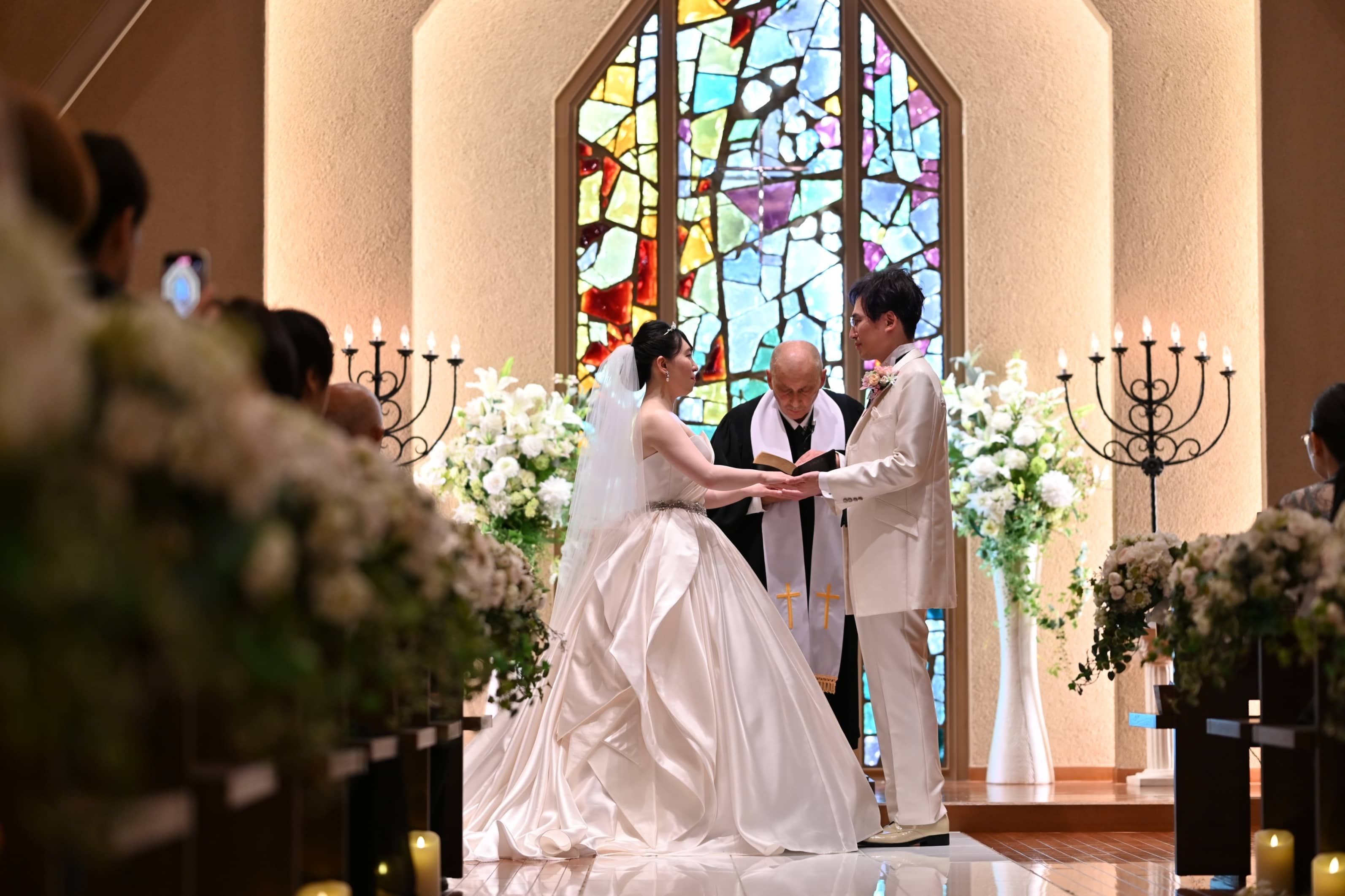 ステンドグラスが煌めき、木の温もりが広がるチャペル。大切なゲストに見守られながら、おふたりの挙式が始まります。