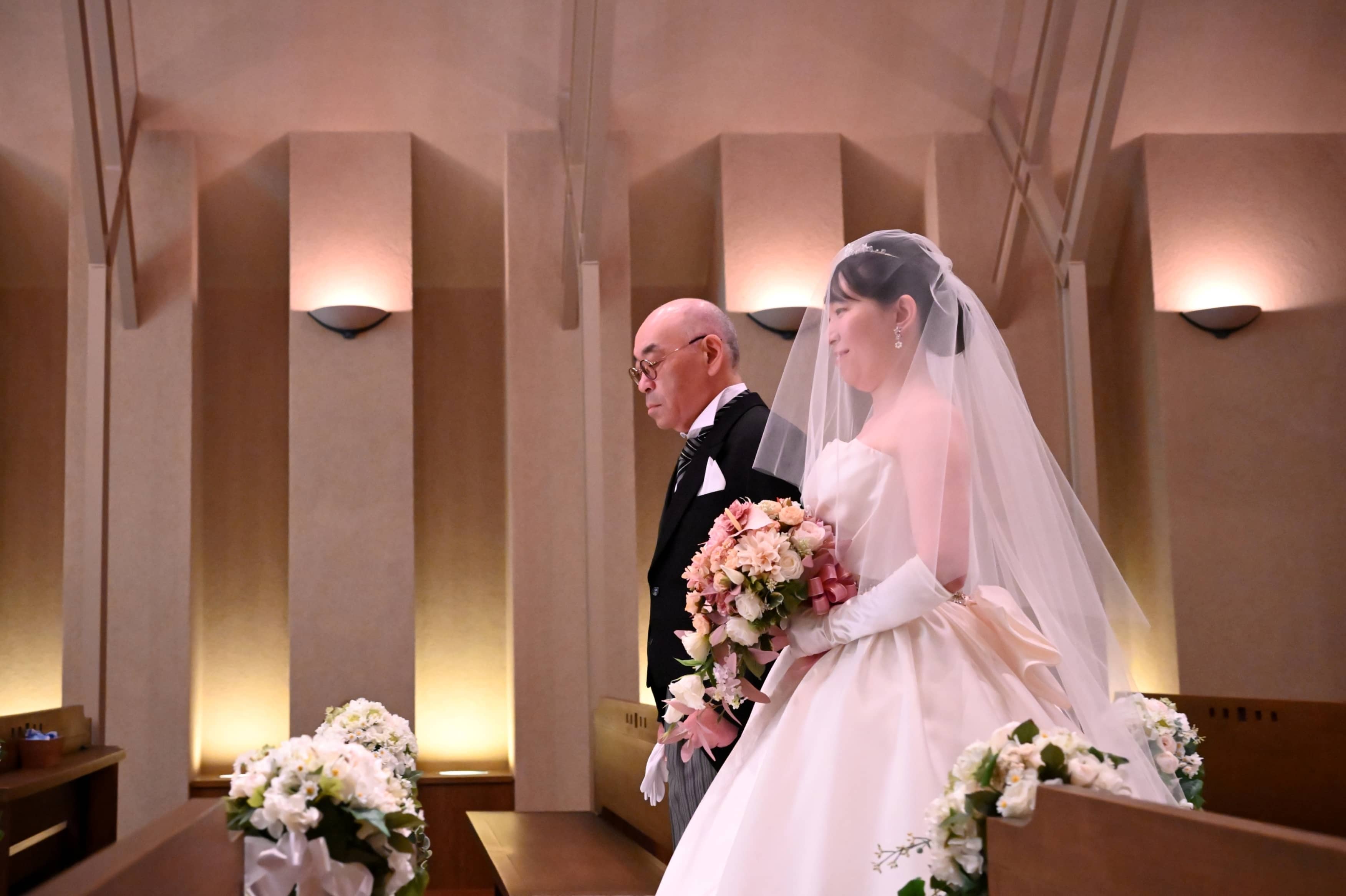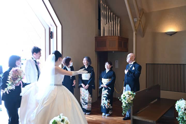 支度を整えたおふたりが向かったのは、チャペルでのリハーサル。大切なご家族だけに見守られながら、挙式前のひとときを過ごします。