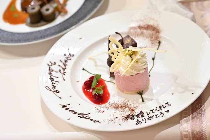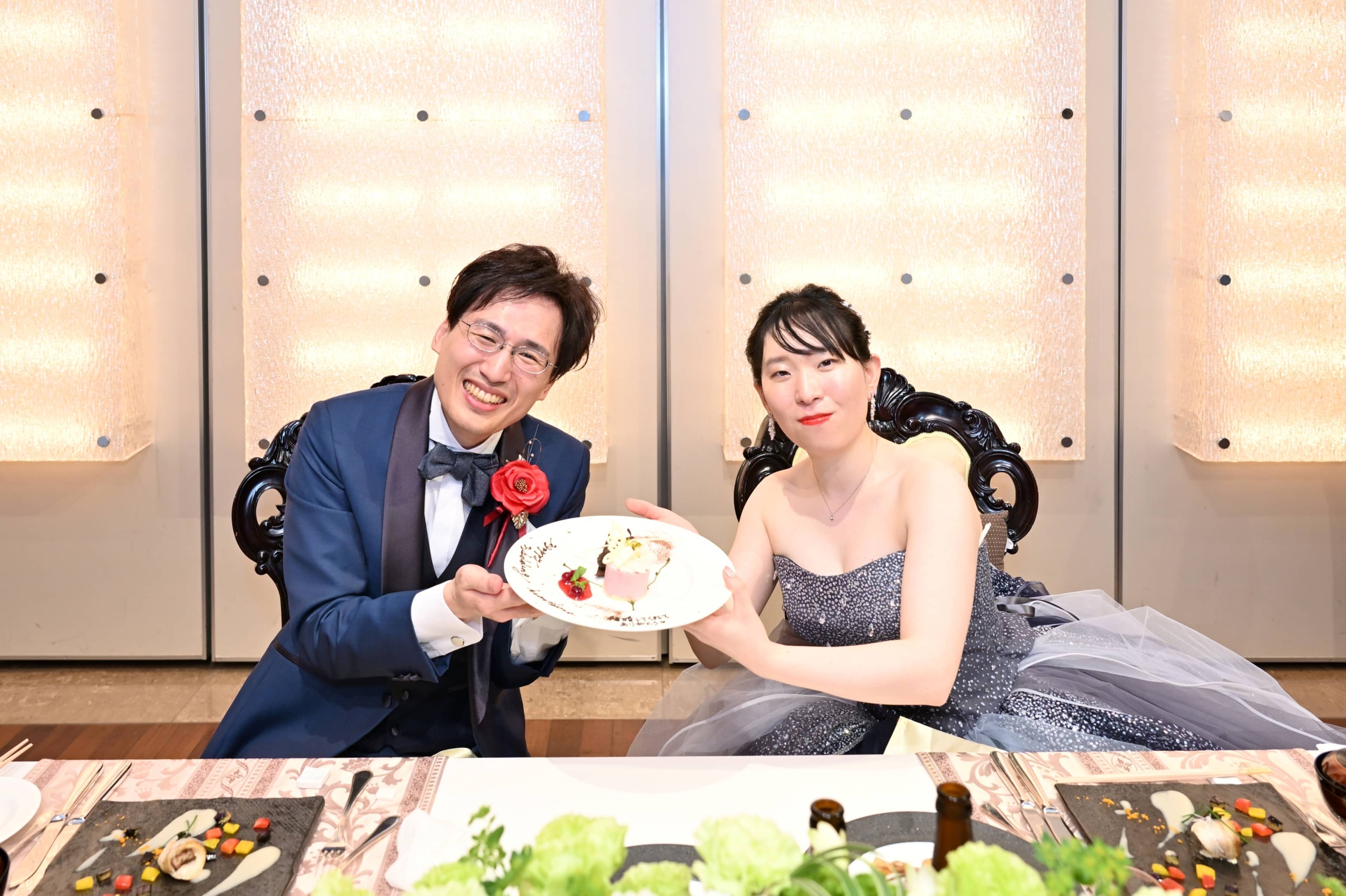 さらに、新婦さまから新郎さまへもサプライズ。メッセージ入りのデザートプレートが届けられ、おふたりの絆と笑顔が、より一層輝く瞬間となりました。