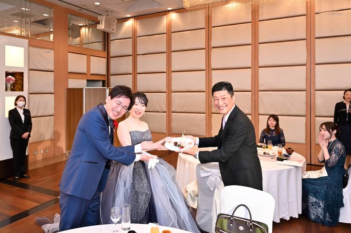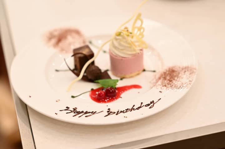 お誕生日のゲストへは、サプライズでバースデーデザートプレートを直接お渡し。思いがけない贈り物に、会場は温かな拍手と笑顔でいっぱいに。