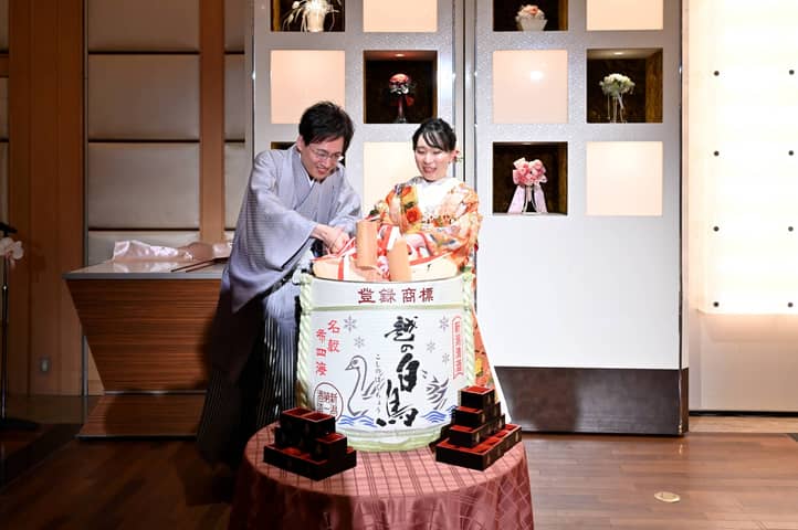 ドレスから和装へと雰囲気をガラッと変えたおふたり。凛とした姿で入場し、日本らしい「鏡開き」のセレモニーで、楽しいパーティが華やかにスタートしました。