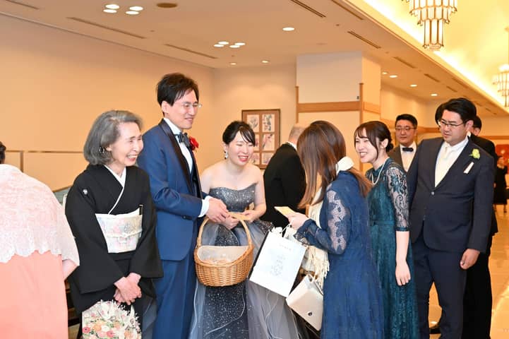 幸せなパーティの結びには、可愛いプチギフトを手に、おふたりがゲスト一人ひとりへ「ありがとう」を丁寧にお届け。