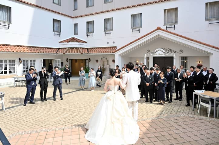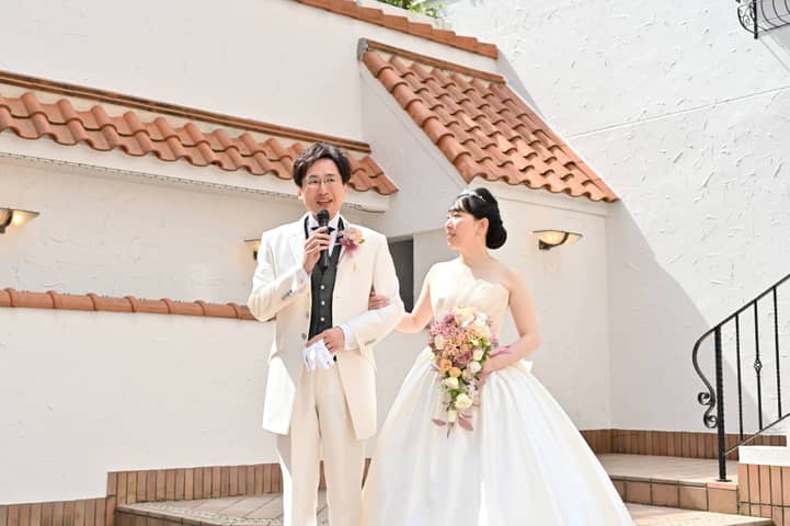 挙式を終えたおふたりが向かったのは、陽光に包まれたガーデンテラス。やさしい光の中で、ゲストへ感謝のご挨拶を届けます。