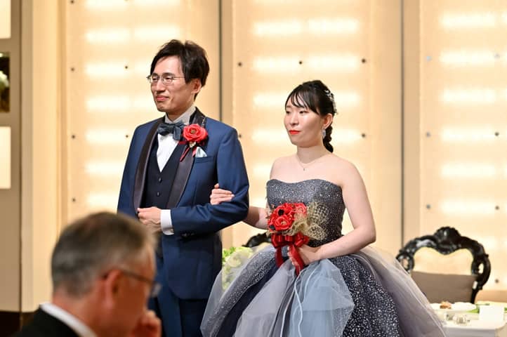ブルーグレーのカラードレスに身を包んだ新婦さま。おふたりは装いを新たに、華やかに再入場しました。